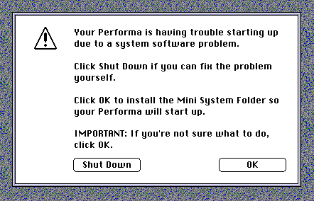 "When a system problem (one that prevents the Performa from booting) is detected, a [dialog box] informs the user of a system problem. The user can choose to fix the problem manually or to reinstall software from the backup partition's Mini System Folder."