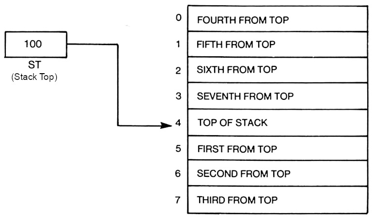 The diagram above shows how the stack operates. The stack consists of eight registers, with the Stack Top (ST) indicating the current top of the stack. To push a floating-point value onto the stack, the Stack Top is decremented and then the value is stored in the new top register. A pop is performed by copying the value from the stack top and then incrementing the Stack Top. In comparison, most processors specify registers directly, so register 2 is always the same register.