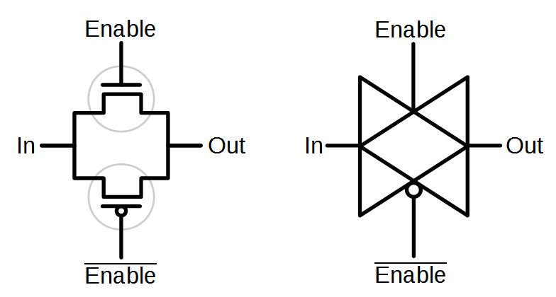 The diagram below shows two transistors (circled) connected to form a transmission gate. The upper one is NMOS and the lower one is PMOS. On the right is the symbol for a transmission gate. Note that because the transistors are complementary, they require opposite enable signals.