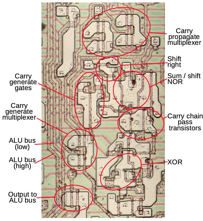 Some features of the ALU remain to be described, in particular the condition flags and how the ALU control signals are generated from opcodes. I plan to write about these soon, so follow me on Twitter @kenshirriff or RSS for updates.