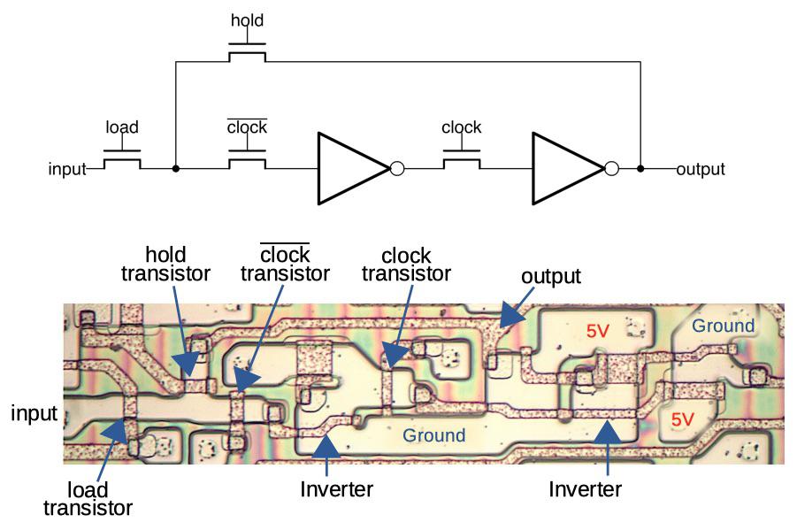 The Intel 8086 microprocessor is one of the most influential chips ever created; it led to the x86 architecture that dominates desktop and server computing today. But it is still simple enough that its circuitry can be studied under the microscope and understood. In this post, I explain the implementation of a dynamic latch, a circuit that holds a single bit. The 8086 has over 80 latches scattered throughout the chip, holding a variety of important processor state bits,1 but I'll focus on the eight latches that implement the instruction register and hold the instruction that is being executed.