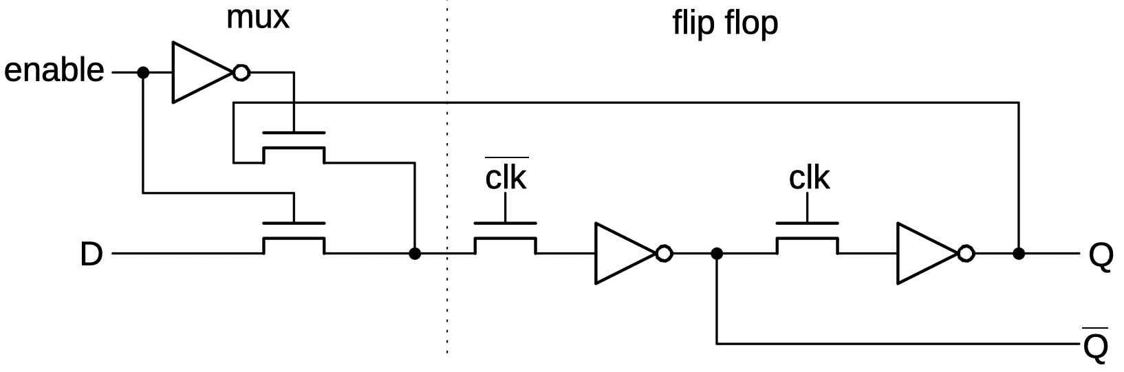 enableinput. Chips with an enable are rarer, such as the 74F377. Strangely, one manufacturer of the 74HC377 shows the enable as affecting the output; I think they simply messed up the schematic in the datasheet since it contradicts the function table.Some examples of standard-cell libraries with enable flip-flops: Cypress SoC, Faraday standard cell library, Xilinx Unified Libraries, Infineon PSoC 4 Components, Intel's CHMOS-III cell library (probably used for the 386 processor), and Intel Quartus FPGA. -