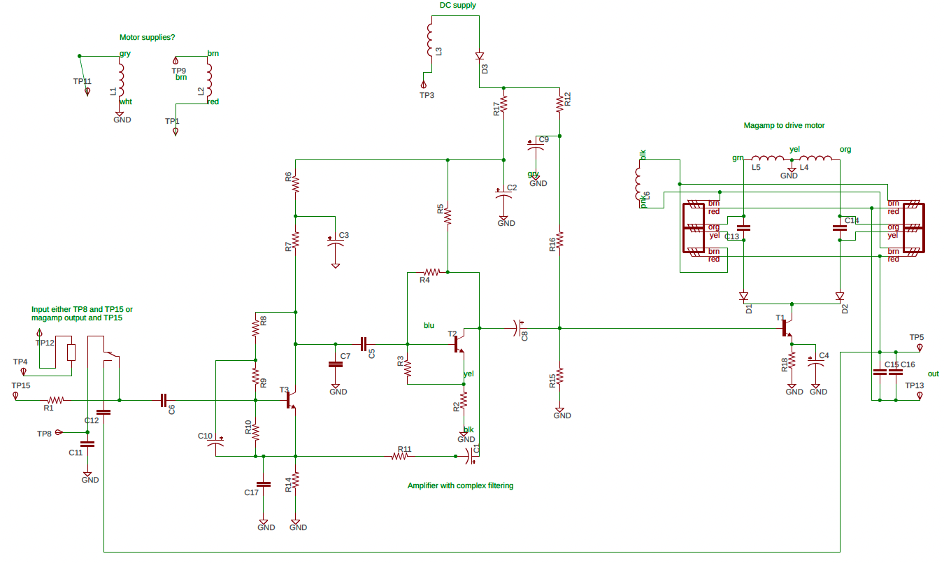 This reverse-engineered schematic probably has a few errors. Click the schematic for a larger version.The CADC has four servo amplifiers: this one for pressure error correction, one for temperature, and two for pressure. The amplifiers have different types of inputs: the temperature input is the probe resistance, the pressure error correction uses an error voltage from the control transformer, and the pressure inputs are voltages from the inductive pickups in the sensor. The circuitry is roughly the same for each amplifier--a transistor amplifier driving two magnetic amplifiers--but the details are different. The largest difference is that each pressure transducer amplifier drives two motors (coarse and fine) so each has two transistor stages and four magnetic amplifiers. -