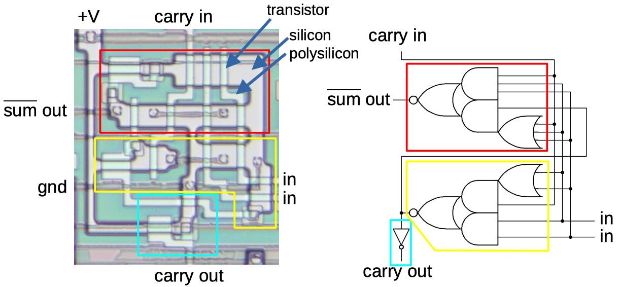 The diagram above shows a full adder stage in the chip. The circuit is built from three relatively complex gates, but if you try the various input combinations, you can see that produces the sum and carry. (Due to the properties of NMOS circuits, it's more efficient to use a small number of complex gates rather than a larger number of simple gates such as NAND gates.)