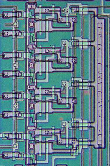 The diagram below shows part of the shift register circuitry as it appears on the die. The blue rectangle indicates one shift register stage. The power, ground, and clock wiring is in the metal layer, which was mostly removed in this image. Shift register stages are linked horizontally. Shift registers for separate bits are stacked vertically, with alternating rows mirrored.